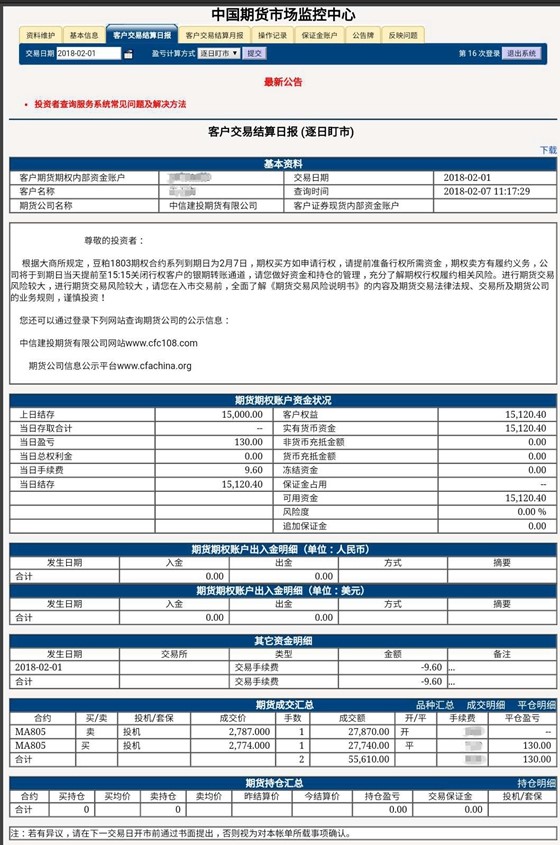 以下是2月6日的交易结算日报。
