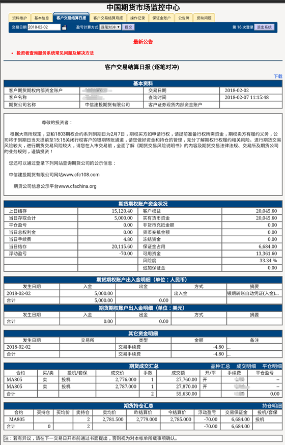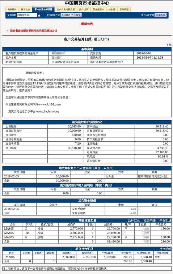 因为期货的结算制度是当日无负债保证金结算,为了确保客户账户内有足够资金供其交易、支配,因此每天都会对当天保证金账户进行结算,结算的数据可以通过中国期货市场监控中心查询。网址为https://investorservice.cfmmc.com/。用户名和密码在客户开户成功后,已通过短信发至客户手机。