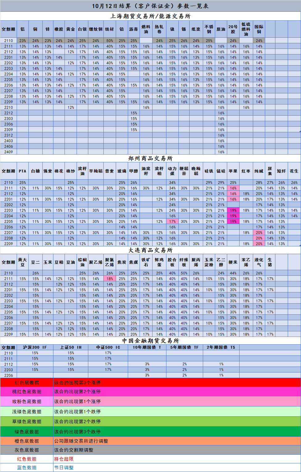 10月12日结算(客户保证金)参数一览表