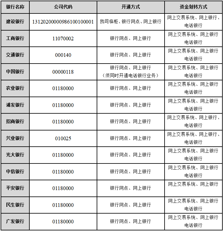 目前我司已经开通了上述银行的全国银期转账业务,客户只要在我司完成开户手续后,携带相关资料即可至银行网点、网上银行或于我司临柜办理开通手续。未开通银期转账的客户只能通过银行汇款方式出入金。