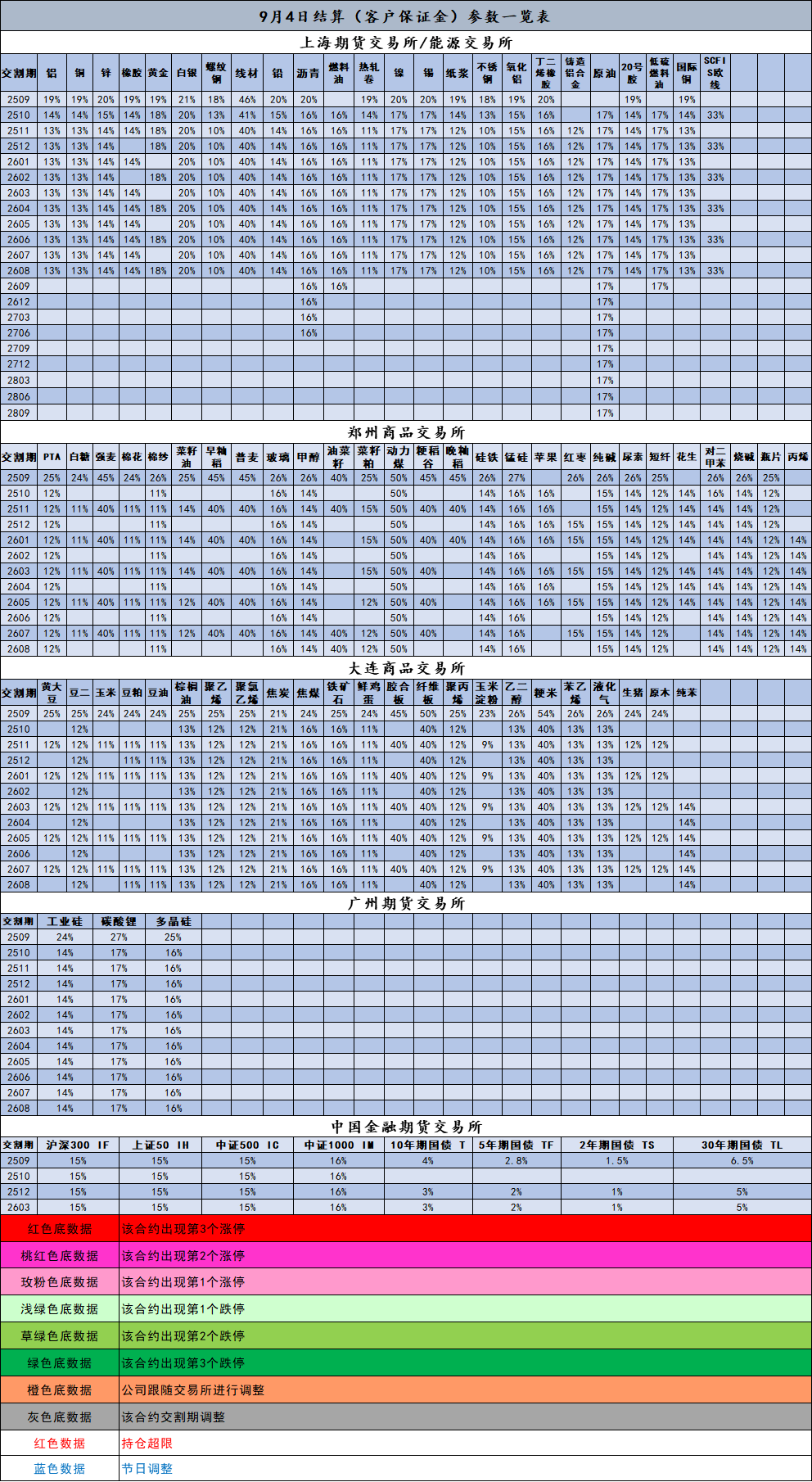 9月4日结算(客户保证金)参数一览表