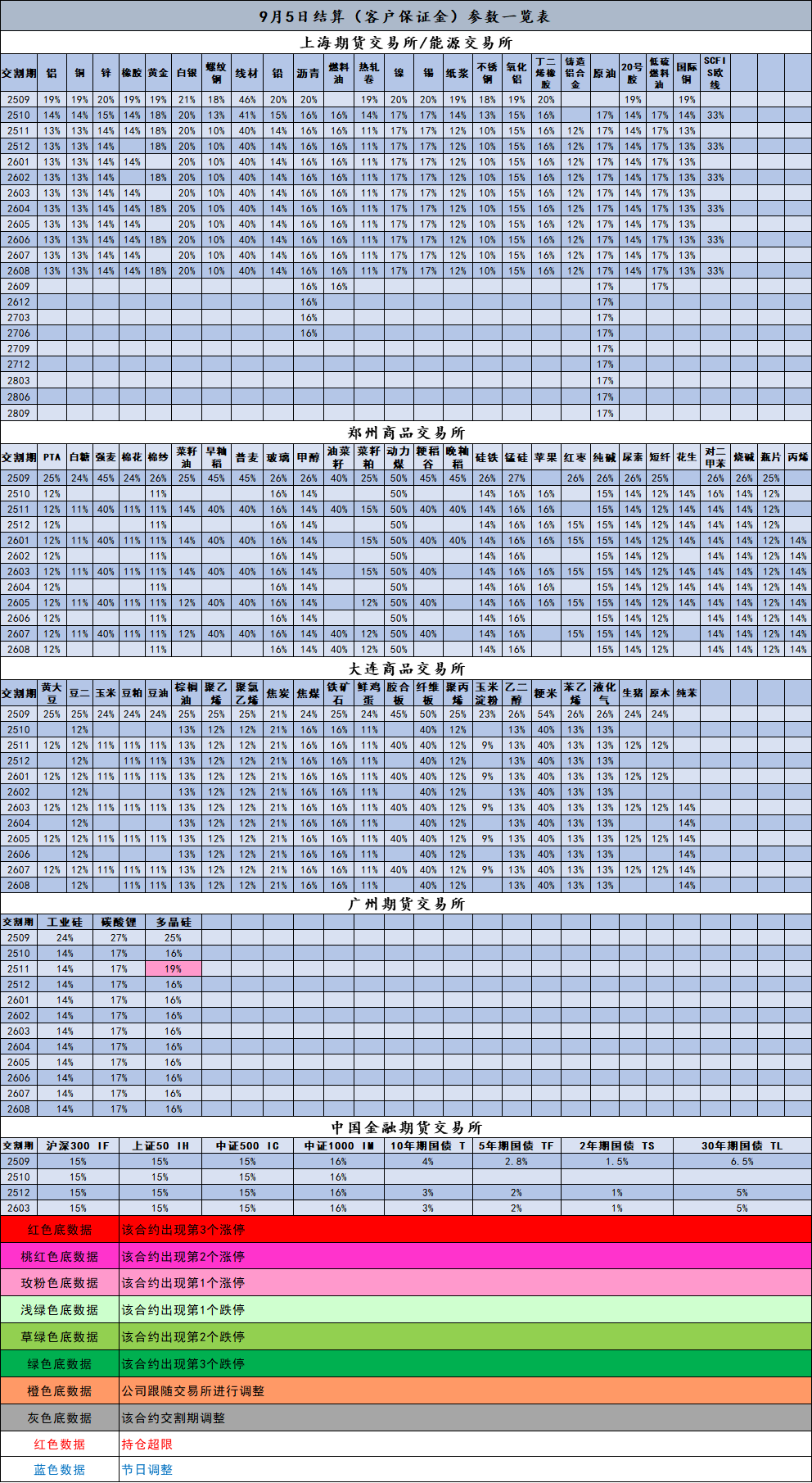 9月5日结算(客户保证金)参数一览表