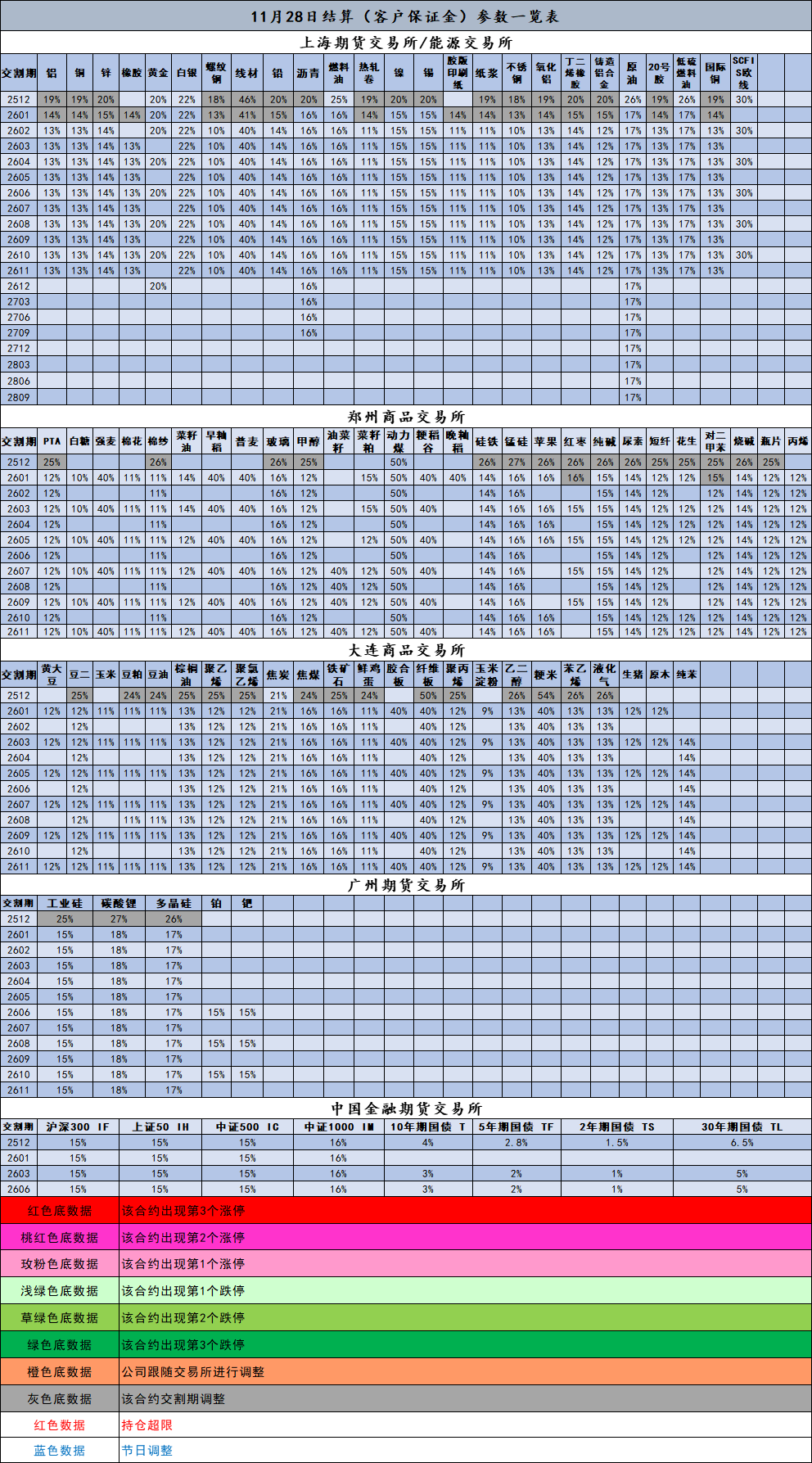 11月28日结算(客户保证金)参数一览表