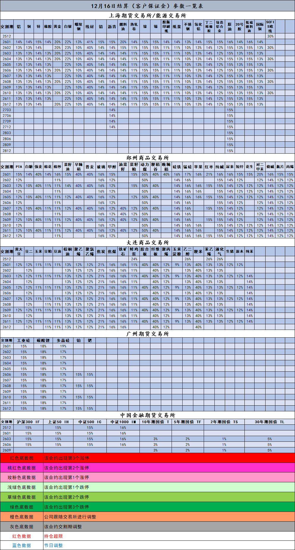 12月16日结算(客户保证金)参数一览表
