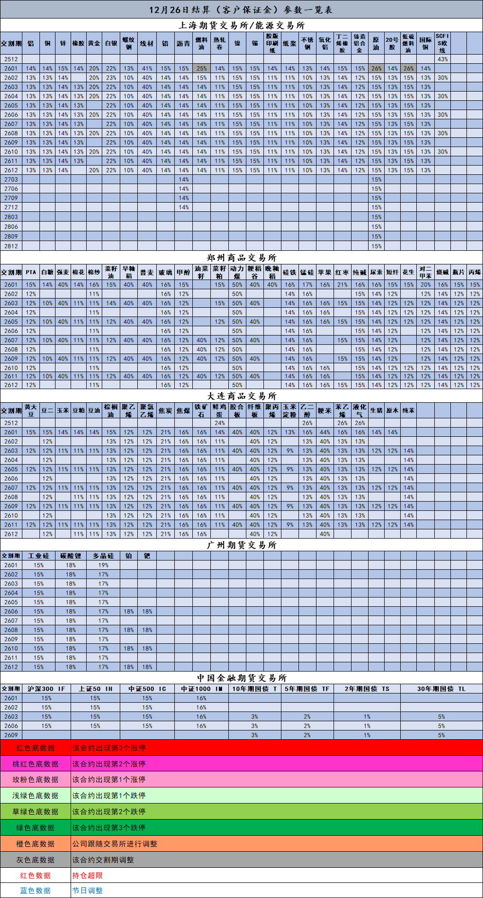 12月26日结算(客户保证金)参数一览表