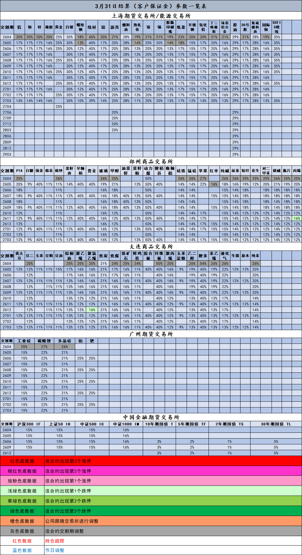 3月31日结算(客户保证金)参数一览表