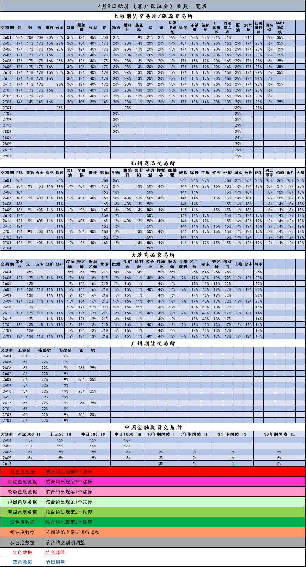 4月9日结算(客户保证金)参数一览表
