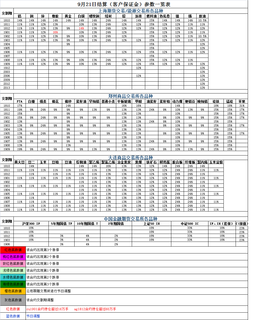 9月21日结算(客户保证金)参数一览表