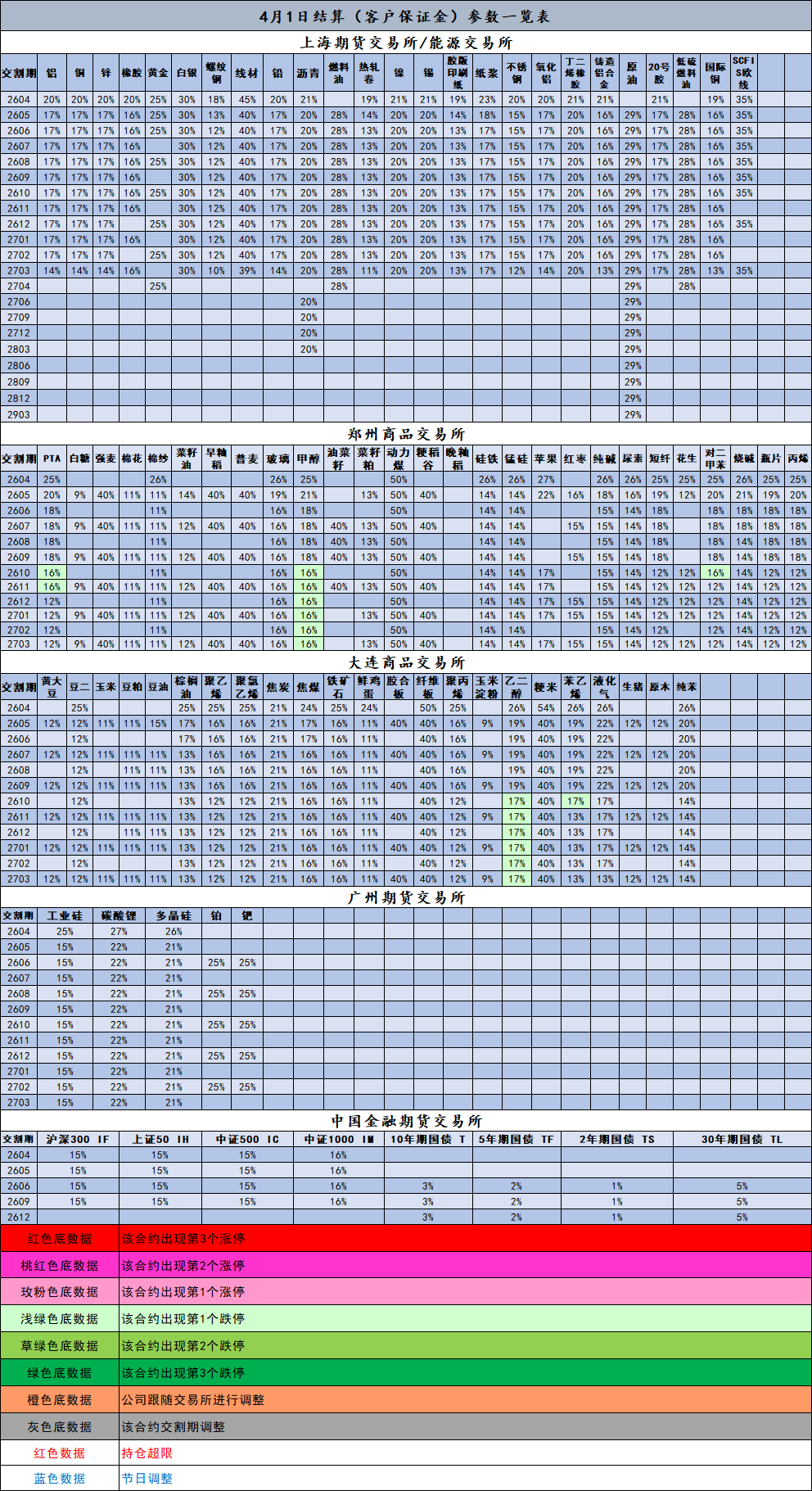 4月1日结算(客户保证金)参数一览表
